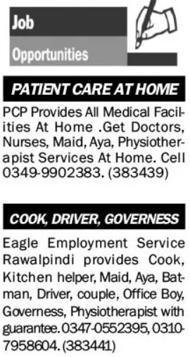 Private Company Islamabad, rawalpindi Islamabad Pakistan invites applications from eligible candidates for the post of governess, cook, physiotherapist, driver, aya, batman, husband wife, patient care, maid, nurse and kitchen helper as per advertisement of April 29, 2024 published in daily The News Newspaper. Educational qualifications required Intermediate, Bachelor, Primary, DPT, Matric and Middle etc.