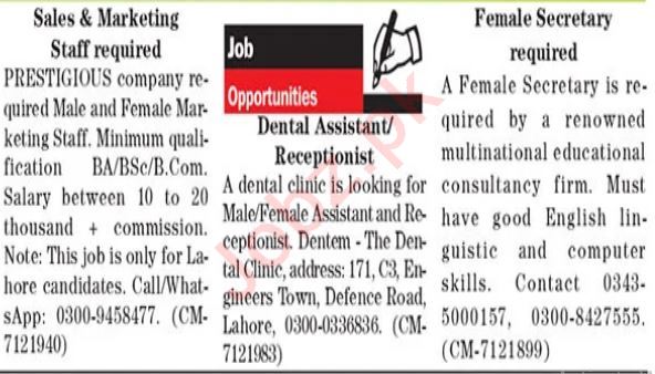 Vacant posts including secretary, receptionist, marketing staff, sales staff, female secretary, sales officer, marketing officer and dental assistant are announced in Private Company Lahore, lahore Punjab Pakistan as per 29 August 2022 advertisement in daily The News Newspaper. Candidates with Matric, Intermediate, Bachelor and Middle etc. educational background will be preferred.