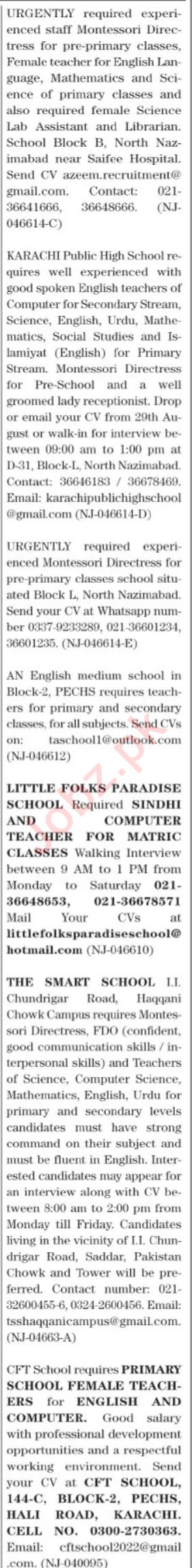 Private School Karachi, karachi Sindh Pakistan invites applications from eligible candidates for the post of mathematics teacher, maths teacher, english teacher, science lab assistant, islamiyat teacher, montessori directress, librarian, primary teacher, english language teacher, lady teacher, social studies teacher, teacher, science teacher, sindhi teacher and urdu teacher as per advertisement of August 29, 2022 published in daily The News Newspaper. Preferred Education is Intermediate, Bachelor and Master etc.