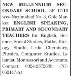 Millennium Schools is looking for candidates for following posts as per job advertisement published in daily The News Newspaper of July 29, 2024 for location Karachi, karachi Sindh Pakistan: