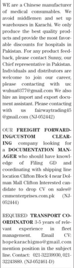 Private Industry invites applications for job positions advertised in daily The News dated 29 July 2024 for following vacancies in Karachi, karachi Sindh Pakistan.