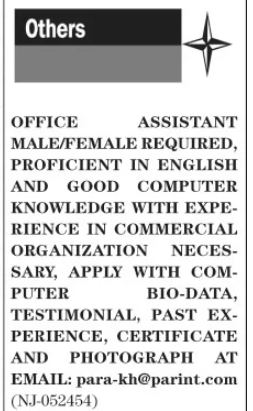 Private Company Karachi, karachi Sindh Pakistan invites applications from eligible candidates for the post of office assistant as per advertisement of July 29, 2024 published in daily The News Newspaper. Preferred Education is Intermediate, BA and Bachelor etc.