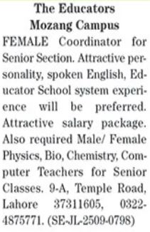 The Educators is looking for candidates for following posts as per job advertisement published in daily The News Newspaper of September 29, 2025 for location Temple Road Lahore, lahore Punjab Pakistan: