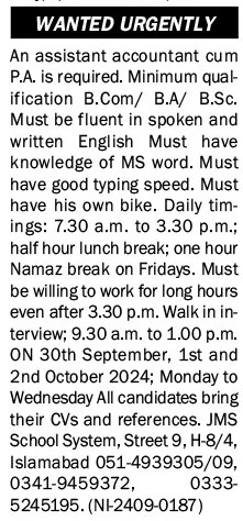 Vacant posts including pa, personal assistant and assistant accountant are announced in Private Company Islamabad, islamabad Islamabad Pakistan as per 30 September 2024 advertisement in daily The News Newspaper. Candidates with Bachelor, B.com and BA etc. educational background will be preferred.