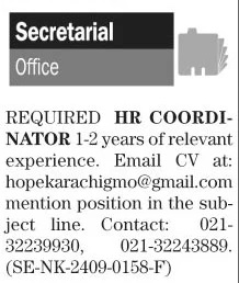Vacant posts including hr coordinator and secretary are announced in Private Company Karachi, karachi Sindh Pakistan as per 30 September 2024 advertisement in daily The News Newspaper. Educational qualifications required BA and Bachelor etc.