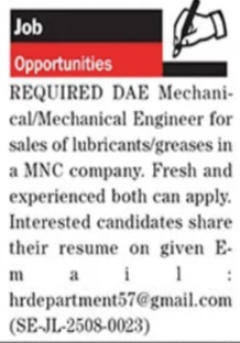 Factory jobs advertisement dated about 4 August 2025 in daily The News Newspaper invites application for the vacant post of mechanical engineer and dae mechanical in Lahore, lahore Punjab Pakistan. Bachelor, Intermediate, DAE and Others etc. educational qualification will be preferred.