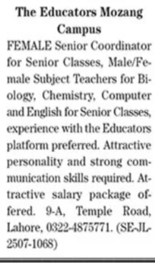 The Educators jobs advertisement dated about 4 August 2025 in daily The News Newspaper invites application for the vacant post of biology teacher, teacher, chemistry teacher, female coordinator, subject teacher, computer teacher, coordinator and english teacher in Temple Road Lahore, lahore Punjab Pakistan. Candidates with Others, M.sc, BA, Bachelor, Master and MA etc. educational background will be preferred.