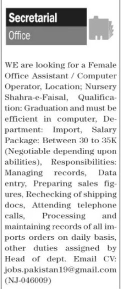 Private Company jobs advertisement dated about 4 July 2022 in daily The News Newspaper invites application for the vacant post of office assistant and computer operator in Karachi, karachi Sindh Pakistan. Candidates with Bachelor and Intermediate etc. educational background will be preferred.