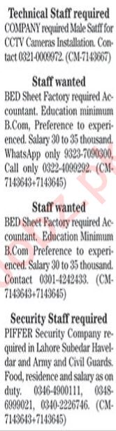 Private Company Lahore, lahore Punjab Pakistan invites applications from eligible candidates for the post of security staff, subedar, cctv camera operator, army guard, havaldar, technical staff, accountant, civil guard and security guard as per advertisement of March 4, 2024 published in daily The News Newspaper. Persons with Matric, DAE, Bachelor, BA, Intermediate, B.com and Middle etc. education can apply.