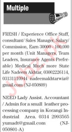 Private Company jobs advertisement dated about 4 September 2023 in daily The News Newspaper invites application for the vacant post of team leader, insurance agent, admin manager, assistant accountant, sales consultant, office staff, sales manager and unit manager in Karachi, karachi Sindh Pakistan. Preferred Education is BBA, Intermediate, MBA, Bachelor, BA, B.com and M.com etc.