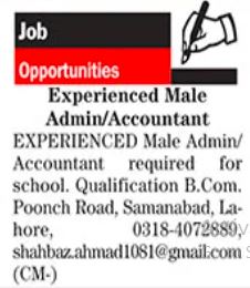 Private Company Lahore, lahore Punjab Pakistan invites applications from eligible candidates for the post of admin manager and accountant as per advertisement of August 5, 2024 published in daily The News Newspaper. Educational qualifications required Bachelor and B.com etc.