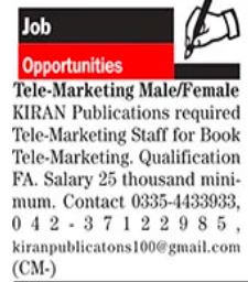 Kiran Publication is looking for candidates for following posts as per job advertisement published in daily The News Newspaper of August 5, 2024 for location Lahore, lahore Punjab Pakistan: