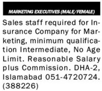Marketing Company Islamabad, islamabad Islamabad Pakistan invites applications from eligible candidates for the post of marketing executive and female marketing executive as per advertisement of August 5, 2024 published in daily The News Newspaper. Preferred Education is Intermediate etc.
