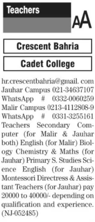Crescent Bahria School is looking for candidates for following posts as per job advertisement published in daily The News Newspaper of August 5, 2024 for location Karachi, karachi Sindh Pakistan: