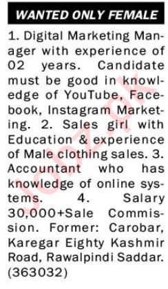 Vacant posts including sales girl, accountant and digital marketing manager are announced in Marketing Company Islamabad, islamabad Islamabad Pakistan as per 5 December 2022 advertisement in daily The News Newspaper. Middle, Intermediate, Matric and Bachelor etc. educational qualification will be preferred.