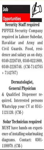 Private Company Lahore, lahore Punjab Pakistan invites applications from eligible candidates for the post of havaldar, doctor, dermatologist, subedar, solar technician, security guard, general physician, civil guard and army guard as per advertisement of February 5, 2024 published in daily The News Newspaper. Candidates with MBBS, DPT, Intermediate, Others, Matric, Bachelor and DAE etc. educational background will be preferred.