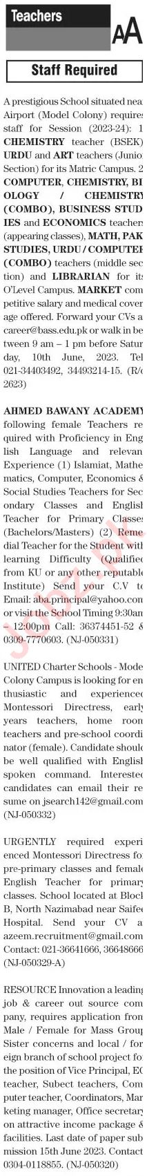 Private School jobs advertisement dated about 5 June 2023 in daily The News Newspaper invites application for the vacant post of islamiat teacher, librarian, lady teacher, biology teacher, business studies teacher, chemistry teacher, social studies teacher, math teacher, computer teacher, montessori directress, urdu teacher, english teacher, pak studies teacher, teacher, art teacher, mathematics teacher and economics teacher in Karachi, karachi Sindh Pakistan. Preferred Education is Master, M.sc, B.ed, BA, MA, M.ed and Bachelor etc.