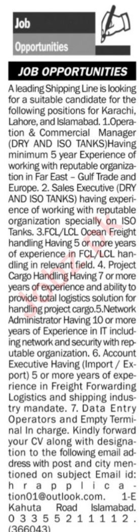 Private Company jobs advertisement dated about 6 February 2023 in daily The News Newspaper invites application for the vacant post of operation manager, sales executive, commercial manager, data entry operator, import executive, network administrator, export executive and account executive in Islamabad, rawalpindi Islamabad Pakistan. Persons with Intermediate, Bachelor and Master etc. education can apply.