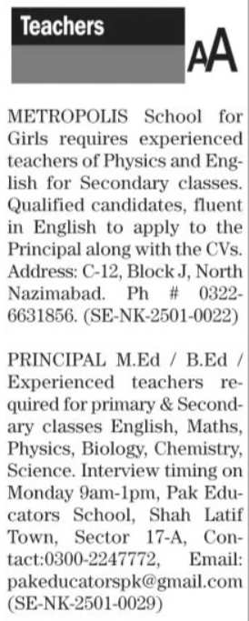 Vacant posts including female teacher, biology teacher, secondary teacher, teacher, science teacher, chemistry teacher, maths teacher, physics teacher, english teacher, primary teacher and principal are announced in Private School Karachi, karachi Sindh Pakistan as per 6 January 2025 advertisement in daily The News Newspaper. Candidates with MA, BA, M.ed, M.sc, Master, B.ed and Bachelor etc. educational background will be preferred.
