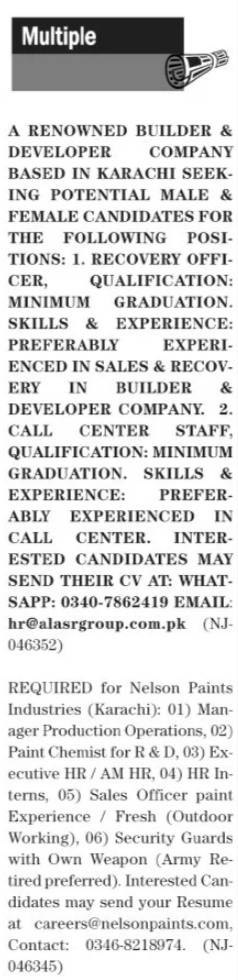 Private Company Karachi, karachi Sindh Pakistan invites applications from eligible candidates for the post of sales officer, paint chemist, recovery officer, call center staff, assistant manager hr, manager production operations, executive hr and security guard as per advertisement of June 6, 2022 published in daily The News Newspaper. Intermediate, Matric, Middle and Bachelor etc. educational qualification will be preferred.