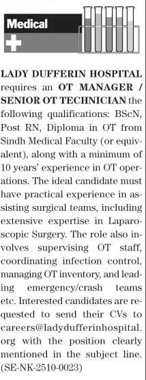 Lady Dufferin Hospital jobs advertisement dated about 6 October 2025 in daily The News Newspaper invites application for the vacant post of ot manager and ot technician in M.A. Jinnah Road Karachi, karachi Sindh Pakistan. Persons with DAE, Intermediate and Bachelor etc. education can apply.