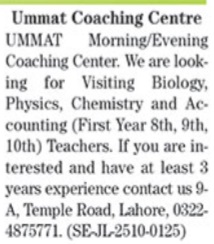 Ummat Evening Coaching jobs advertisement dated about 6 October 2025 in daily The News Newspaper invites application for the vacant post of physics teacher, chemistry teacher, accounting teacher, teacher, biology teacher, home tutor and tutor in Temple Road Lahore, lahore Punjab Pakistan. Persons with Master, Bachelor and M.sc etc. education can apply.