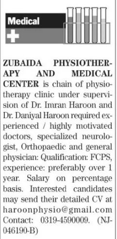 Zubaida Physiotherapy & Medical Centre Karachi Sindh Pakistan invites applications from eligible candidates for the post of neurologist, lady doctor, general physician, doctor and orthopedic surgeon as per advertisement of February 6, 2022 published in daily The News Newspaper. Persons with Others and MBBS etc. education can apply.