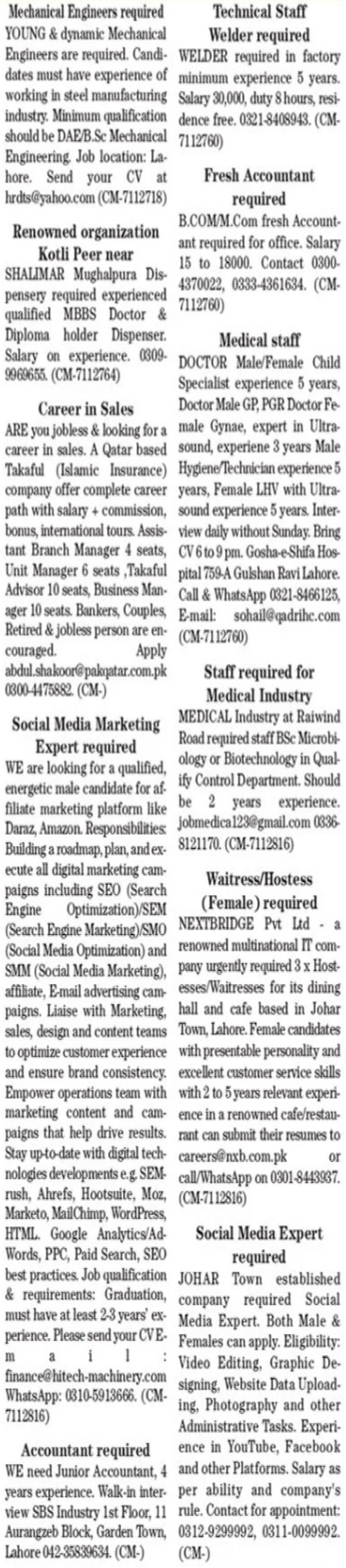 Private Company Lahore Punjab Pakistan invites applications from eligible candidates for the post of doctor, child specialist, hostess, seo expert, social media marketing expert, lady doctor, assistant branch manager, lhv, engineer, business manager, takaful manager, unit manager, gynecologist, welder, quality control officer, microbiologist, accounts officer, mbbs doctor, lady health visitor, waitress, dispenser, social media expert, engineer mechanical, technical staff and accountant as per advertisement of February 6, 2022 published in daily The News Newspaper. Educational qualifications required Intermediate, Others, Middle, MBBS, Matric and Bachelor etc.