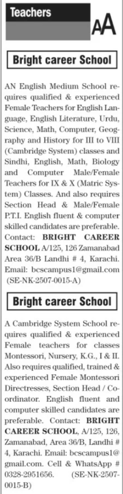 Bright Career Public Model High School is looking for candidates for following posts as per job advertisement published in daily The News Newspaper of July 7, 2025 for location Landhi Karachi, karachi Sindh Pakistan: