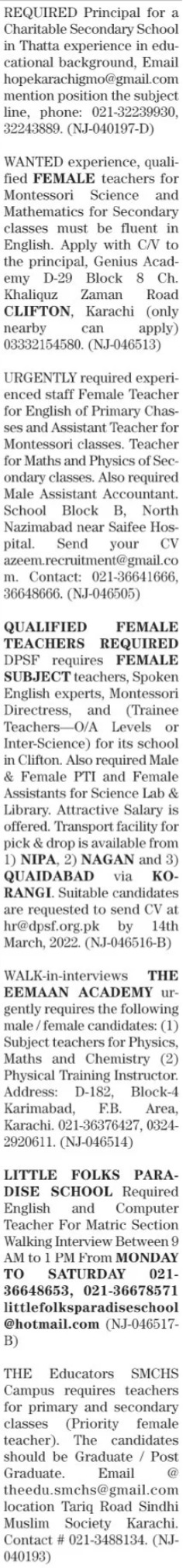 Private School jobs advertisement dated about 7 March 2022 in daily The News Newspaper invites application for the vacant post of spoken english teacher, secondary teacher, o level subject teacher, montessori directress, female pri, assistant teacher, primary teacher, teacher, physical training instructor, subject teacher, principal, computer science teacher, maths teacher, physics teacher, mathematics teacher, a level teacher, library assistant, montessori teacher, female teacher, assistant accountant, science teacher, pti, lab assistant and trainee teacher in Karachi, karachi Sindh Pakistan. Bachelor and Master etc. educational qualification will be preferred.