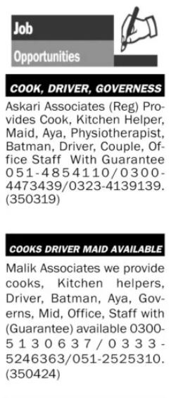 House jobs advertisement dated about 7 March 2022 in daily The News Newspaper invites application for the vacant post of driver, batman, maid, kitchen helper, office staff, cook, aya, governess, physiotherpist and husband wife in Islamabad, islamabad Islamabad Pakistan. Educational qualifications required Middle, Primary and Matric etc.