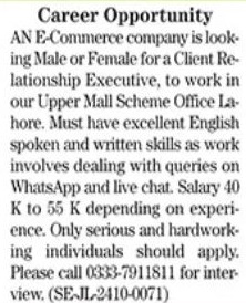 E Commerce Company is looking for candidates for following posts as per job advertisement published in daily The News Newspaper of October 7, 2024 for location Lahore, lahore Punjab Pakistan: