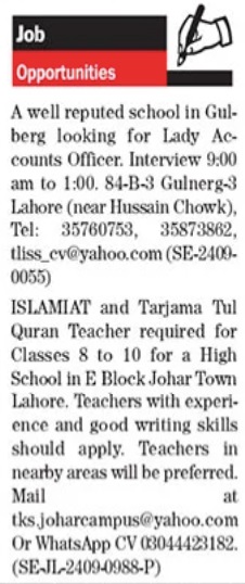 Private School jobs advertisement dated about 7 October 2024 in daily The News Newspaper invites application for the vacant post of islamiat teacher, accounts officer, quran teacher, teacher and lady accounts officer in Lahore, lahore Punjab Pakistan. Candidates with Bachelor, B.com, BA and Intermediate etc. educational background will be preferred.