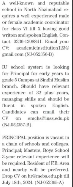 Private School Karachi, karachi Sindh Pakistan invites applications from eligible candidates for the post of academic coordinator and principal as per advertisement of July 8, 2024 published in daily The News Newspaper. Candidates with Master, M.sc and MA etc. educational background will be preferred.