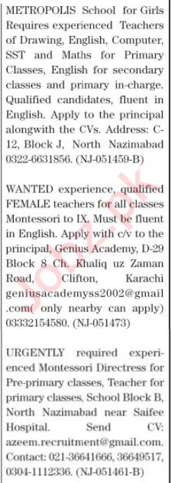 Private School invites applications for job positions advertised in daily The News dated 8 January 2024 for following vacancies in Karachi, karachi Sindh Pakistan.