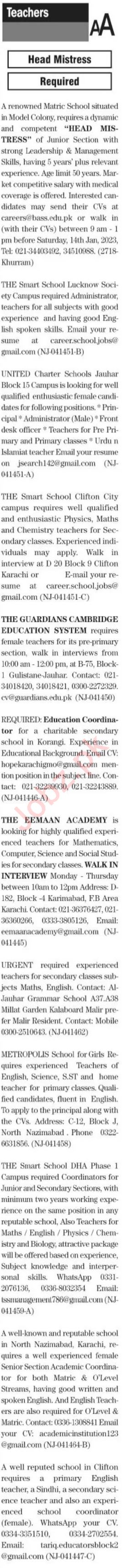 Private School Karachi, karachi Sindh Pakistan invites applications from eligible candidates for the post of social studies teacher, physics teacher, administrator, urdu teacher, head mistress, maths teacher, coordinator, education coordinator, teacher, chemistry teacher, principal, mathematics teacher, biology teacher, front desk officer, computer science teacher and islamiat teacher as per advertisement of January 9, 2023 published in daily The News Newspaper. Master, Bachelor and Intermediate etc. educational qualification will be preferred.