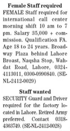 Private Company Lahore, lahore Punjab Pakistan invites applications from eligible candidates for the post of driver, security guard and call center agent as per advertisement of December 9, 2024 published in daily The News Newspaper. Preferred Education is Middle, Matric, Bachelor and Intermediate etc.