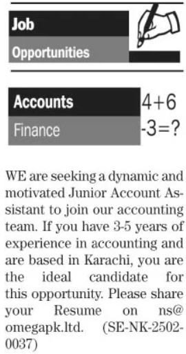 Omega Technologies jobs advertisement dated about 10 February 2025 in daily The News Newspaper invites application for the vacant post of account assistant and accountant in Karachi, karachi Sindh Pakistan. Preferred Education is Bachelor, B.com and BBA etc.