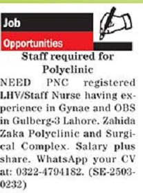 Hospital Clinic invites applications for job positions advertised in daily The News dated 10 March 2025 for following vacancies in Gulberg 3 Lahore, lahore Punjab Pakistan.