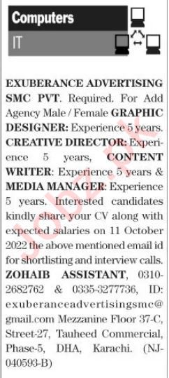 Vacant posts including graphic designer, content writer, creative director and media manager are announced in IT Company Karachi, karachi Sindh Pakistan as per 10 October 2022 advertisement in daily The News Newspaper. Matric, Bachelor and Intermediate etc. educational qualification will be preferred.