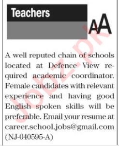 Private School invites applications for job positions advertised in daily The News dated 10 October 2022 for following vacancies in Karachi, karachi Sindh Pakistan.