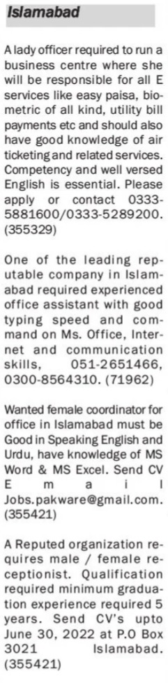 Private Company Islamabad, islamabad Islamabad Pakistan invites applications from eligible candidates for the post of female coordinator, receptionist, office assistant, coordinator and lady officer as per advertisement of June 20, 2022 published in daily The News Newspaper. Educational qualifications required Middle, Intermediate, Bachelor and Matric etc.
