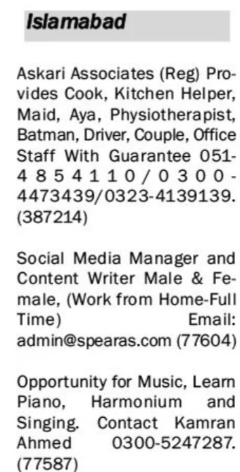 Private Company jobs advertisement dated about 5 August 2024 in daily The News Newspaper invites application for the vacant post of aya, content writer, batman, social media manager, office staff, cook, maid, husband wife, physiotherapist, driver and kitchen helper in Islamabad, islamabad Islamabad Pakistan. Middle, DPT, Intermediate, Bachelor, Matric and BA etc. educational qualification will be preferred.