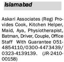 Askari Associates Pvt Ltd jobs advertisement dated about 7 October 2024 in daily The News Newspaper invites application for the vacant post of aya, cook, kitchen helper, husband wife, maid, batman, office staff, driver and physiotherapist in Islamabad, islamabad Islamabad Pakistan. Persons with Matric, Intermediate, Primary, Middle and DPT etc. education can apply.