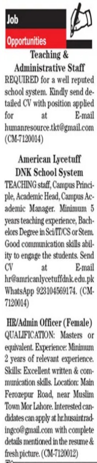Vacant posts including principal, hr officer, administrative staff, admin officer, academic head, campus academic manager and teaching staff are announced in Private Company Lahore, lahore Punjab Pakistan as per 18 July 2022 advertisement in daily The News Newspaper. Educational qualifications required Bachelor, Intermediate, Matric and Master etc.