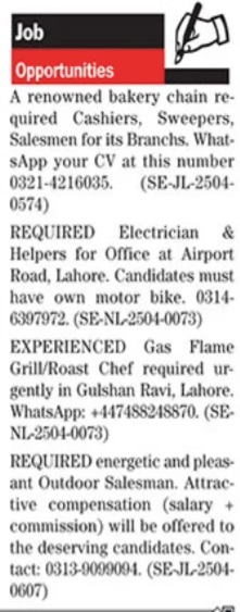 Private Company jobs advertisement dated about 21 April 2025 in daily The News Newspaper invites application for the vacant post of chef, salesman, helper, electrician, cashier and sweeper in Airport Road Lahore, lahore Punjab Pakistan. Candidates with Intermediate, Matric, BA, Bachelor and Middle etc. educational background will be preferred.