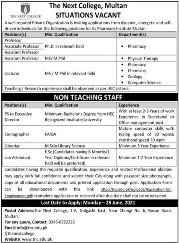 The Next College invites applications from highly educated expert and experienced professionals for the post of Professor, Associate Professor, Assistant Professor, Lecturer, Personal Secretary, Executive Director, Stenographer, Librarian, Lab Attendant in Multan.