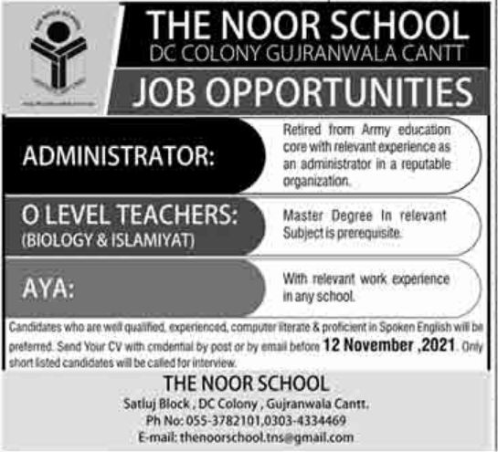 The Noor School Gujranwala Cantt Jobs 2021 For Administrator