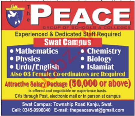 The Peace Group of Schools and Colleges is inviting application from experienced and energetic candidates for the post of Mathematics Teacher, Chemistry Teacher, Physics Teacher, Biology Teacher, Islamiat Teacher, Urdu Teacher, English Teacher, Coordinator in Swat.