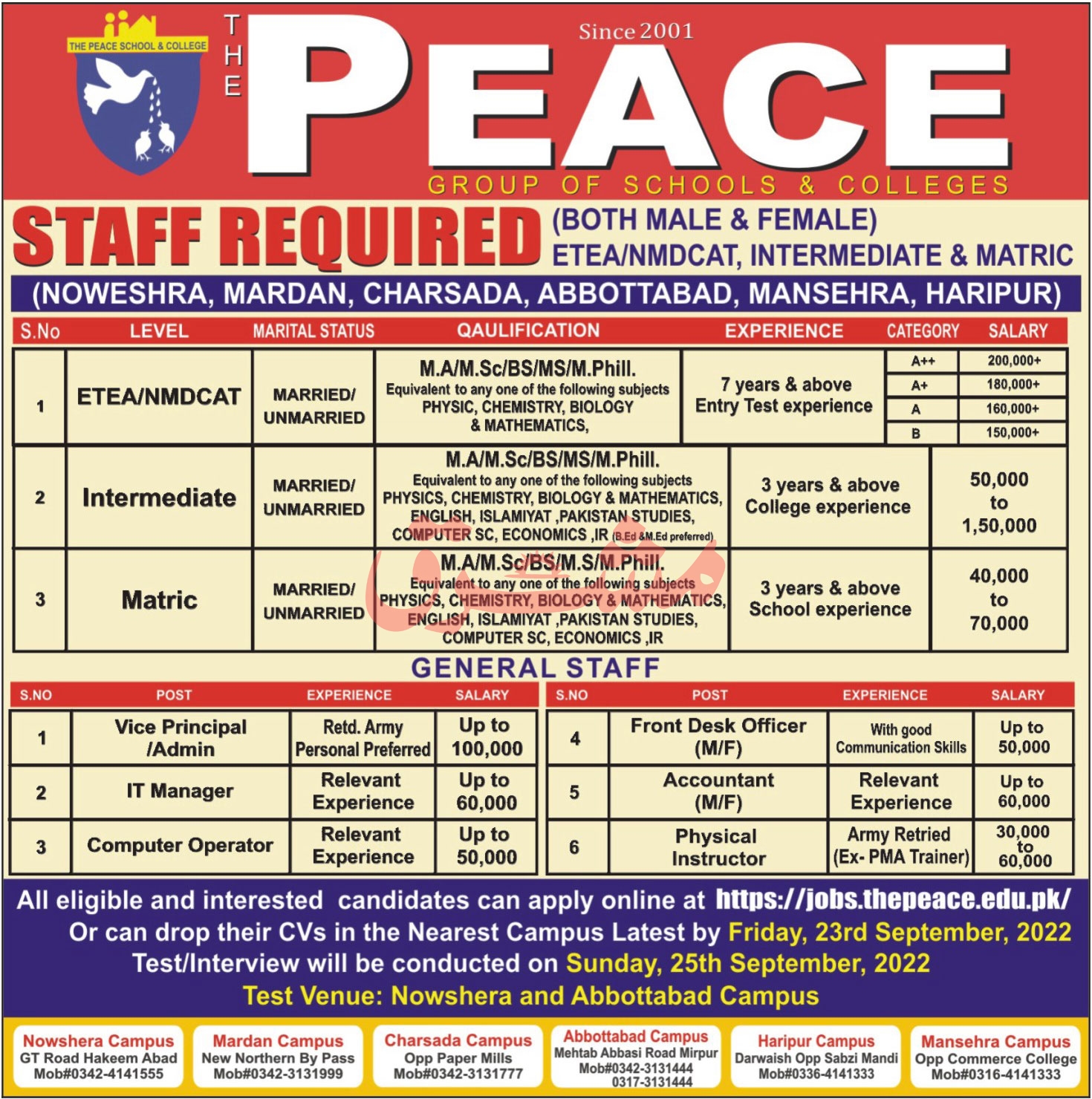 The Peace Group of Schools and Colleges Intermediate Faculty of Science Pre-Medical Pre-Engineering. admissions 2022 has been announced. Eligible students can apply for academic admissions 2022 in The Peace Group of Schools and Colleges Abbottabad Khyber Pakhtunkhwa KPK Pakistan for Teaching School. Students for admissions in Intermediate & criteria can apply as per Private institute admission policy 2022 before closing date September 23, 2022 as per advertisement. Read newspaper ad for exact details.